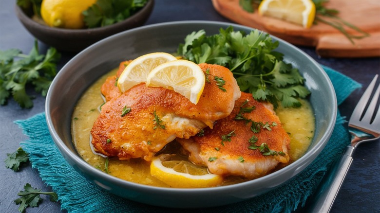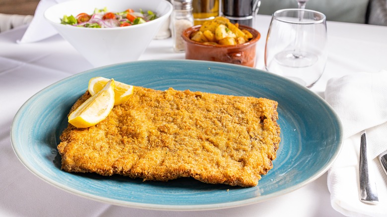 Like chicken francese, chicken milanese also starts with pounded-thin chicken breast cutlets that get cooked in a large skillet. Although, unlike francese, chicken milanese gets dredged in flour, egg wash, and Panko breadcrumbs, making for a crunchier texture and savory coating. Once breaded, the cutlets are pan-fried in oil until golden brown, ideally to an internal temperature of 165 degrees Fahrenheit (a meat thermometer can be a lifesaver for successful chicken milanese).