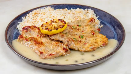 To serve, pair chicken francese with a bright arugula salad, roasted asparagus, garlicky escarole, sauteed broccoli rabe, mashed parsnips, or garlic bread. Garnish with caramelized lemon wheels and chopped fresh parsley. For a full-circle presentation, serve your chicken francese with a glass of the same dry white wine you used to make the creamy pan sauce. Pinot Grigio, Chardonnay, and Sauvignon Blanc work well here. Just make sure to opt for a high enough quality bottle that you would actually want to drink a full glass of it. It'll make a world of difference in the flavor of your sauce and, subsequently, the completed dish. Chicken francese is also delicious served with pasta or rice, which can help bulk up the meal for leftovers or make-ahead meal prep.
