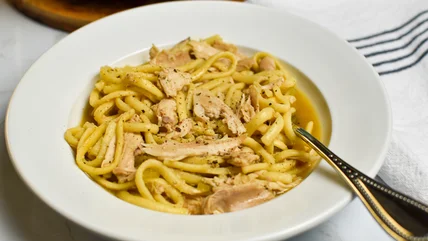 To understand what Amish-style cooking is, start with the recipes that feed their communities throughout the day. With a full day's labor ahead, breakfasts such as the Amish breakfast casserole tend to be hearty and filling. It combines hen-house eggs with onion, bacon, and shredded hash browns. Other ingredients regularly make appearances — including oatmeal, cereal, nuts, and dried fruits — depending on the recipe. Lunch tends to repurpose leftovers from the previous night's dinner into sandwiches, especially for kids in school. Dinner remains the major meal of the day and regularly features pot pies, Amish-style chicken and noodles, and scrapple — cornmeal and buckwheat flour baked with pork bits, often offal. Popular desserts include shoofly pie, pumpkin cheesecake, and apple dumplings.