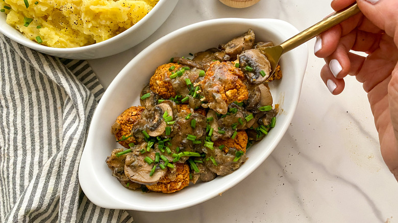 While there are so many recipes where chickpeas are the star, Tasting Table's Miriam Hahn has created a tasty but simple recipe for savory vegetarian meatballs served with a quick mushroom gravy, but of course, you could eat them any way you like! A jar of your favorite barbecue sauce would provide a quick way to enjoy the chickpea meatballs as an appetizer, or you can experiment with other herbs and spices.