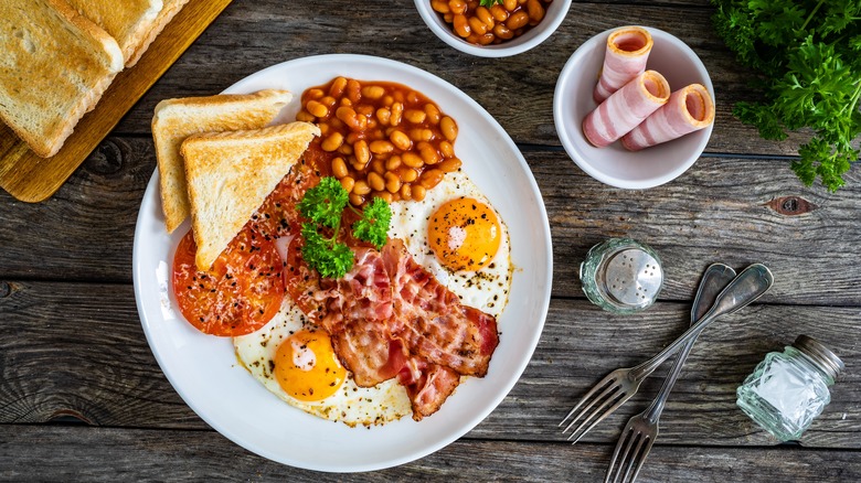 A tempting plate of beans and toast certainly doesn't need to be boring. Though the familiar dish is quick and simple to put together (and very popular in England), you can easily upgrade your meal with a few easy ingredient inclusions. While caramelized onions can upgrade a standard plate of beans piled on top of crunchy toast, bringing bacon into the mix can turn up the dials of savory, smoky notes of flavor. Whether layering maple-smoked bacon or oven-baked bacon on top of buttery bread, you'll be on your way to enjoying a satisfying recipe that can help ward off hunger until the next mealtime.