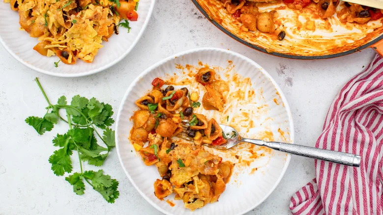 The love of beans crosses cultures, which makes them the perfect base for some real creative fusion dishes, like this Mexican-inspired pasta. A simple mixture of shells and marinara sauce gets upgrades with a garden of southwestern additions like corn, onion, red pepper, and canned black beans while getting a little spicy flair from taco seasoning. Using some stock to thin everything out, the pasta gets cooked directly in the sauce and, just before it's done, it gets finished off with a sprinkling of cheese and put under a broiler to brown. The end result is a best of two continents creation that's impossible to resist.