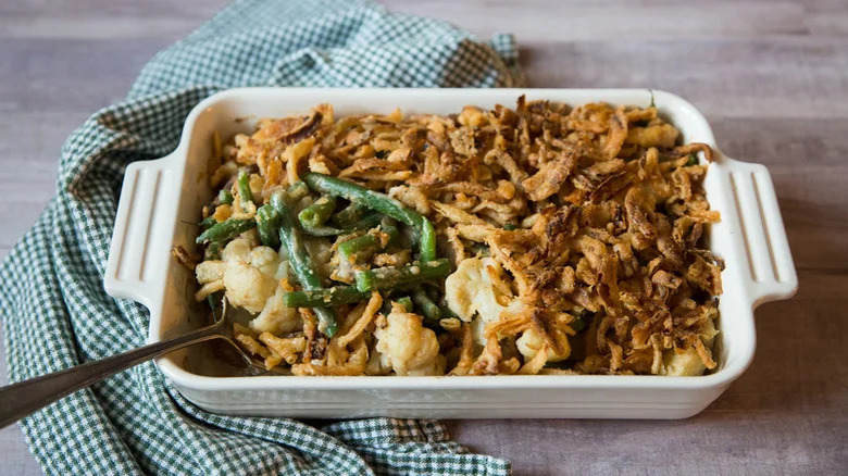 We all love our old favorites, but dishes that rely on processed ingredients like the original green bean casserole are ripe for reinvention. Fresh green beans remain the star, but the canned mushroom soup gets replaced by a homemade gravy that gets a hefty kick of vegan savory flavor from tahini. Cauliflower helps turn this side dish into a proper main course, and the rich and creamy mix gets topped with the essential crispy onions before going into the oven. Even with the homemade gravy it's an easy dish to throw together and only takes a half hour from kitchen to table.