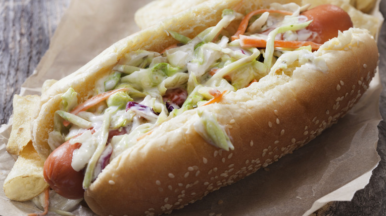 Coleslaw may be an unexpected topping, sure, but all the things that make it great on its own — the creaminess, the crunch, the flavor — make it a refreshing and tasty contrast to the meat. West Virginia-style slaw dogs already make use of the tangy side — it's dolloped on top of a chili dog. Once you try creamy coleslaw as a topping, you'll find that it adds a refreshing element that cuts through the fat and provides a crunchy texture that contrasts well with the softness of the bun. The vinegar in the coleslaw also adds a punch that works with the savory flavor of the hot dog.