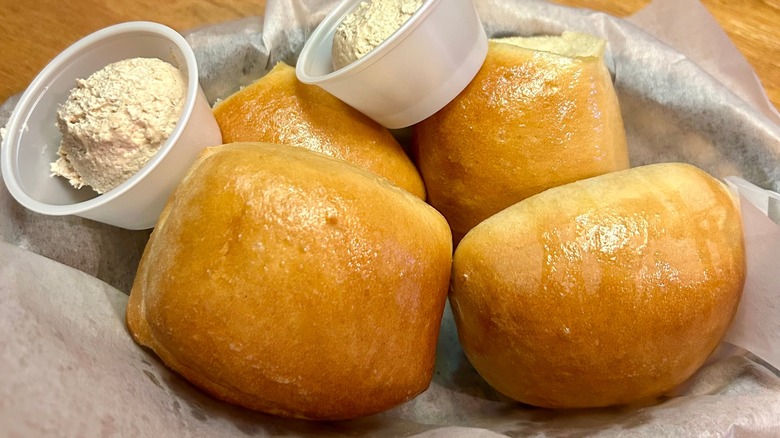 The rolls are supposedly inspired by a recipe made by Texas Roadhouse founder Kent Taylor's grandmother. Since opening, Texas Roadhouse has remained committed to making these buns from scratch. Placed onto tables in a welcoming fashion, baskets of these golden rolls are served with a side of sweet cinnamon butter. Locations are known to crank out thousands of these pillowy rolls each day. When swim teams roll up to a restaurant and pack in over 100 rolls in a single sitting, it's no wonder in-house bakeries are kept busy.