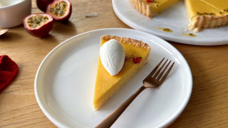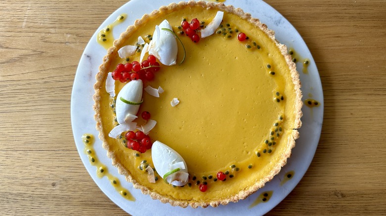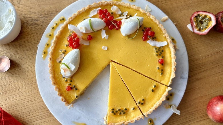 You don't need fresh passion fruit to make this recipe, and you certainly don't have to wait for passion fruit season, either. This tart can add a unique twist to your menu year-round, from winter holiday celebrations to summer dinner parties under the stars. Recipe developer Katie Rosenhouse says, "Passion fruit is always a staple flavor on restaurant dessert menus, and for good reason — the invigorating flavor, typically made into curds, ice creams, mousse, and other creamy components, is a crowd-pleaser with a delightfully bright, tropical taste."