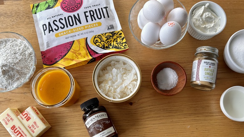 This dessert comes together in two parts: a buttery, coconut-studded crust and a creamy passion fruit filling. To make the crust, you'll need pantry staples — all-purpose flour, granulated sugar, kosher salt, unsalted butter, milk, and an egg yolk. Ground ginger adds a touch of warmth that helps ground the passion fruit filling, and unsweetened coconut flakes enhance the tropical flavor.