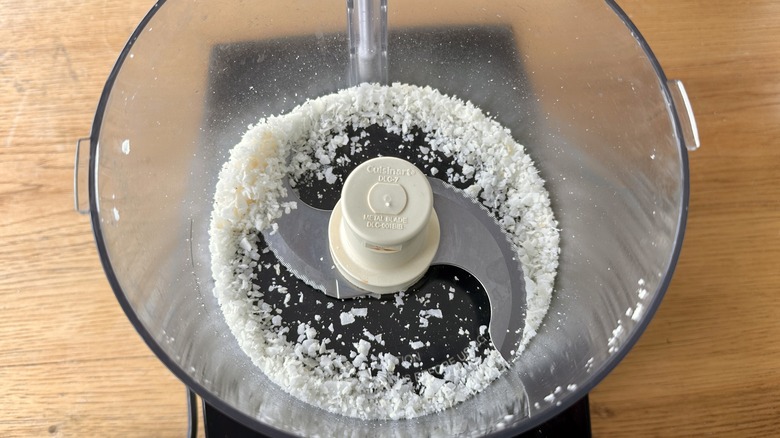 - Prepare the crust: In a food processor, pulse the coconut into small flakes.