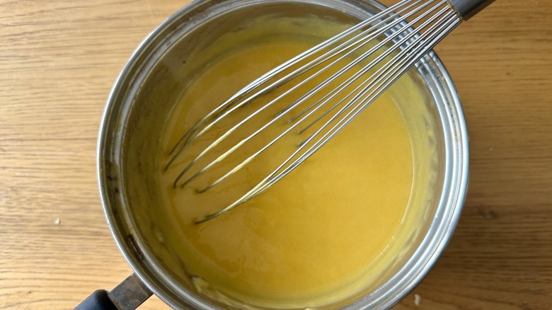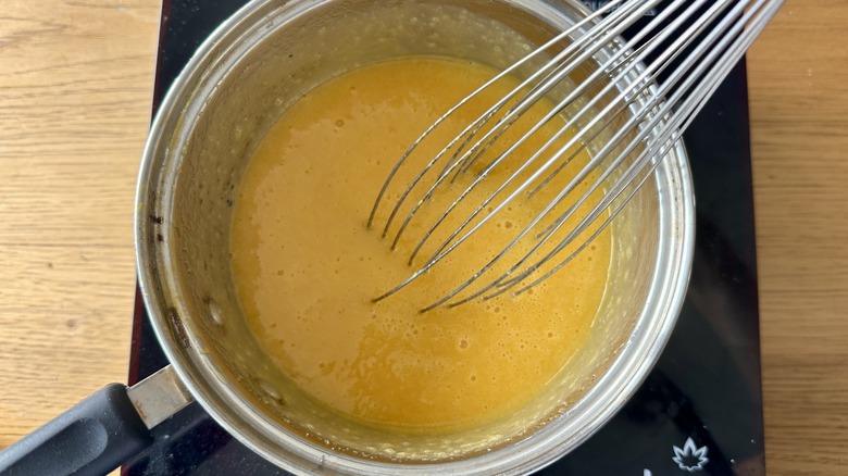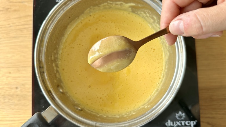 - Cook over low heat, whisking constantly, until thickened enough to coat the back of a spoon.
