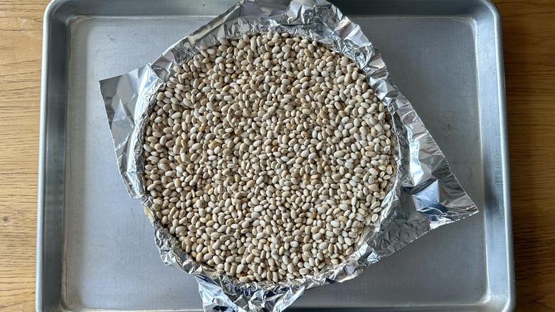 - Line the tart pan with aluminum foil and fill it with pie weights or dried beans.