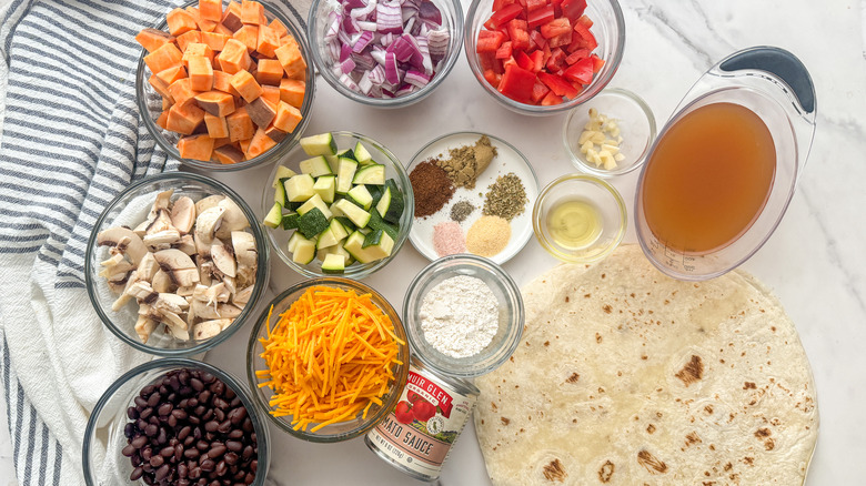 Gather the ingredients for roasted vegetable and black bean enchiladas
