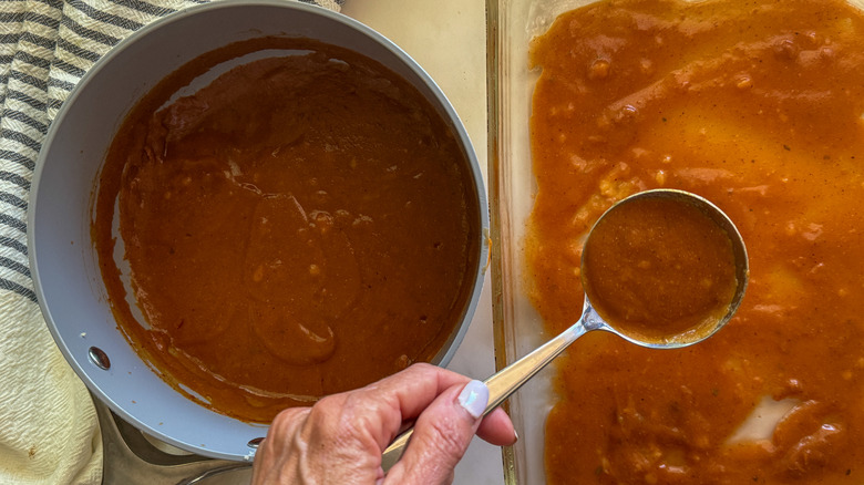 Spread out ½ cup of the enchilada sauce in the baking dish.