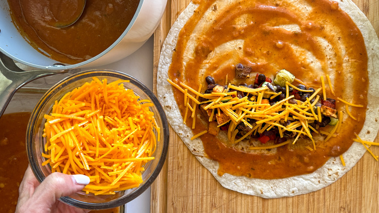 - Fill each tortilla by spreading 1–2 tablespoons of enchilada sauce, some of the vegetable and bean mixture, and about ¼ cup of cheese.