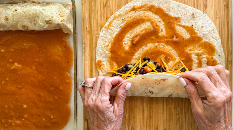 - Roll up the tortillas, leaving the ends open, and place them seam-side down in the baking dish. Repeat with the remaining tortillas.
