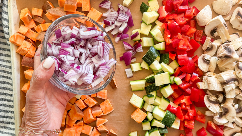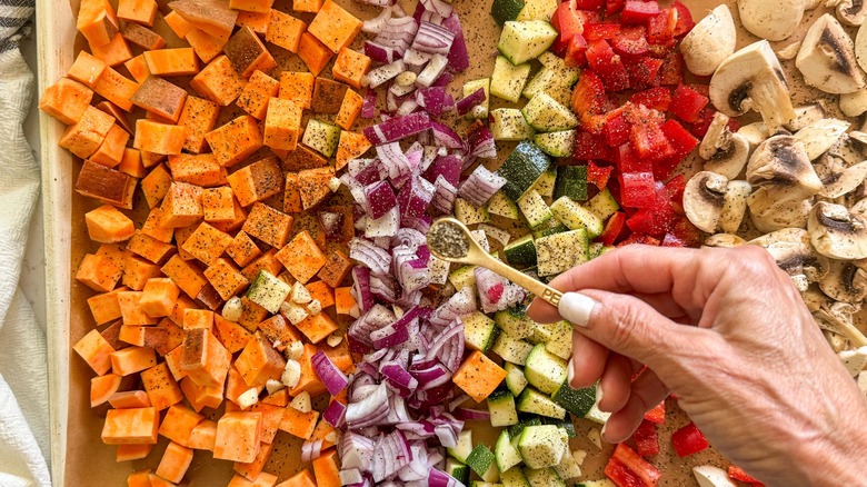 - Spread out the sweet potato, zucchini, red pepper, red onion, mushrooms, and garlic on the sheet pan.