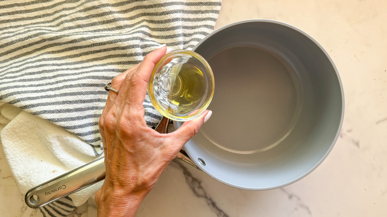 - While that is cooking, make the enchilada sauce by adding the oil to a small pot and bringing the heat to medium.