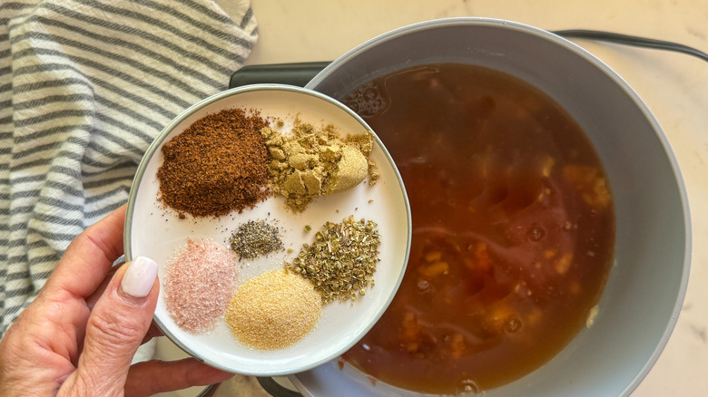 - Now, add the chili powder, cumin, garlic, oregano, the remaining salt and black pepper, tomato sauce, and broth. Simmer for 15 minutes, stirring frequently.