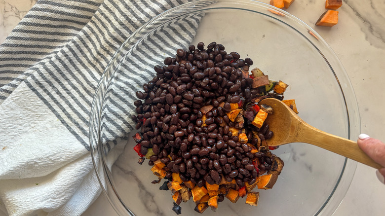 To add more protein to the dish, dice or crumble in some super firm tofu or tempeh. You can also add in more beans, or use a different type, such as pinto, kidney, or garbanzo. If you are not strictly vegetarian, add in cooked chicken or ground beef.