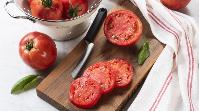 Beefsteak tomato is actually a category containing several different tomato varieties, all of them larger, with more substantial fleshy interiors. These are the tomatoes you'll usually find sliced on burgers and sandwiches. Vine tomatoes are easy to spot thanks to their still attached stems, with a range of sizes from medium to smaller varieties. Nutritionally most tomatoes are equally good for you no matter the variety, providing vitamin C and antioxidants like lycopene and beta-carotene. And as we'll discover, the most flavorful tomato is a ripe tomato, no matter how they are displayed at the store.