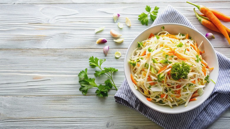 There are so many ways you can customize your slaw to exactly what you like. Of course, you can keep it totally classic by shredding some white cabbage and carrots and pairing it with a tangy mayo dressing. You might also consider using some red cabbage or other crunchy veggies, like celery, radish, sprouts, or even some kohlrabi. Some people prefer to add some sweetness by using apples (making for a strong flavor combo with pork). Or, perhaps you want to give this topping a little twist and add some cilantro, chiles, and sriracha mayonnaise. If you don't like the heaviness of the mayonnaise, opt for a mayo-free slaw and make a vinaigrette, or simply dress it with some vinegar, olive oil, and seasonings.