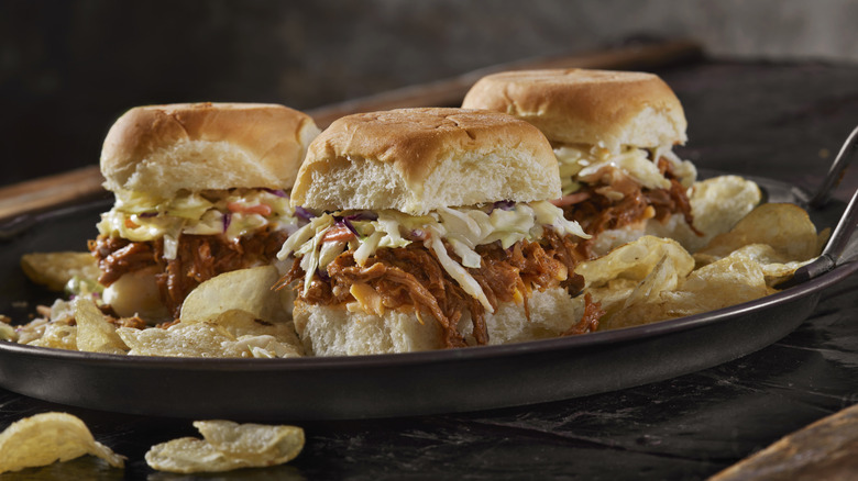 There are various bread options to use, but soft buns are key to delicious pulled pork sandwiches. Since the meat is so tender, the bun can't be too dense and chewy, which makes soft buns the perfect carrier. The filling is also likely to spill out if your bread isn't soft enough. However, keep in mind that you need to find the perfect balance between soft and sturdy, because your buns need to carry the meat and absorb its juices while still holding everything together. If the buns are too soft, the bread could disintegrate in your hands from the moisture of the sauce. Soft Hawaiian buns are an ideal choice for pulled pork, and they're also pretty easy to find at your local grocery store. A decent alternative would be some brioche or even good old-fashioned hamburger buns.