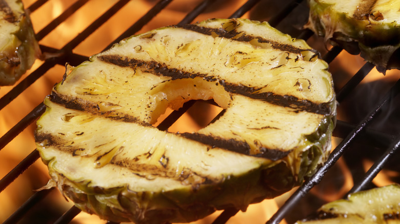 You can always use raw pineapple in your pulled pork sandwich, but grilling the fruit makes it a little caramelized and soft, while also removing any sharpness that can make pineapple a little unpleasant to eat. This method is also simple to do if you've already got your grill, smoker, oven, or barbecue going to cook your pork: You can simply add your pineapple slices to a wire rack right at the end of your cooking. Although you might be tempted to take a shortcut, fresh pineapple is better than canned when it comes to grilling. The natural sugar of the fresh fruit will caramelize better than fruit that has been stewed or cooked in syrup, and it won't be as overly sweet as the canned stuff.