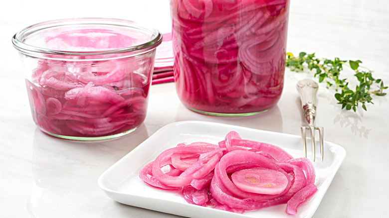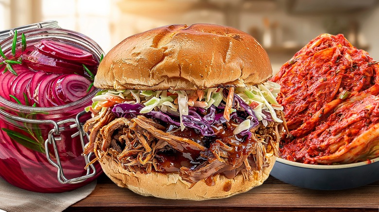 Pulled pork contains a lot of fatty goodness, but this can be a bit much if you don't add an ingredient to cut through the richness. Pickles, for example, can bring a little sharpness. You can use any pickled veggie you love, but a truly complementary type for pulled pork is pickled red onions. Using red onions over white or yellow onions works well because their slight sweetness goes well with pork — and when pickled, they turn into a beautiful purple-pink color that is visually appealing. Their acidity not only offers relief from the fatty pork, but also the sweetness of whatever sauce you're using, such as BBQ sauce. Red onions are also not overly acidic, so they won't overpower the rest of the meal.
