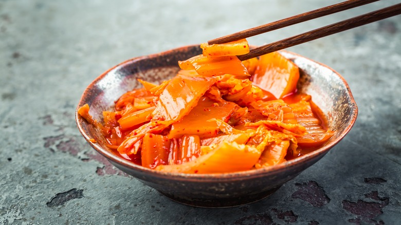 For those who love spicy food, you should consider adding kimchi to your pulled pork sandwich. If you haven't heard of it before and are wondering what kimchi is, it's a popular Korean staple made of fermented cabbage and chile paste or powder. Kimchi is sour, spicy, and deeply complex in taste, so it goes with many dishes — especially with rich foods — as its acidity and spiciness will cut through and make for a more balanced palate.