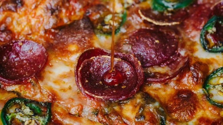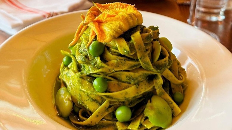 Flay has noted he particularly enjoys its brussels sprout pizza — a white pizza with mozzarella, smoked pancetta, brussels sprouts leaves, garlic, and pecorino — and the soppressata, which comes with tomato sauce, mozzarella, soppressata, chili flakes, and oregano. Now, the latter pie is deemed spicy. However, if adventure is what you seek, know that it also comes in a super spicy version (though we can't say which version Flay prefers).