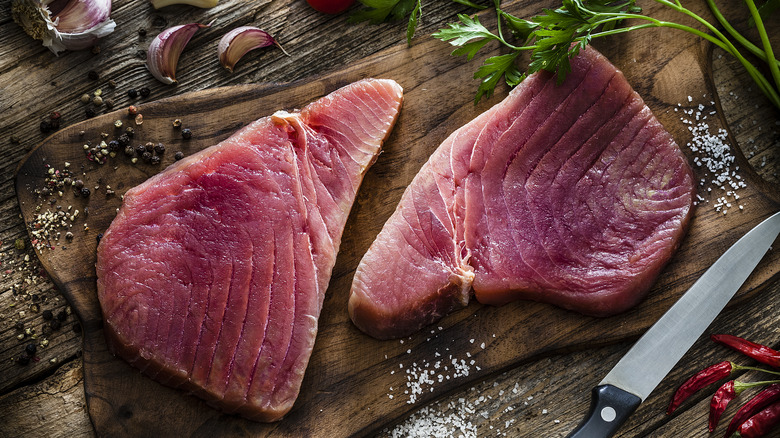 You've unwrapped the fresh tuna steaks you purchased at your local market, and depending on which type of tuna you bought, its firm flesh runs the gamut from ruby red to pale pink in color. But before you grill your tuna steaks or sear them, you might have the impulse to rinse them off. For many families, washing meat and poultry is a generational ritual or a religious tradition, as in the preparation of Kosher meats. Washing tuna steaks, or any other fish, meat, or poultry, might seem like the best way to remove potentially harmful bacteria, but it's actually the opposite. In a 2019 report issued by the USDA, researchers concluded that the bacteria washed off any protein can accumulate in high levels in the sink and splash onto kitchen surfaces, increasing the risk of cross-contamination with other foods.