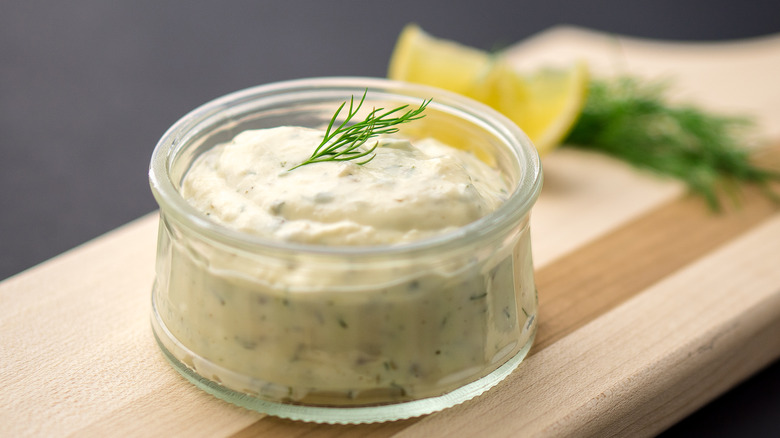 The vast majority of egg salad recipes hinge on dollops of mayonnaise to create the creamy dish many of us enjoy. Surprisingly, or not, there are many ways to make egg salad without the mayo to make the dish healthier or give it more flavor. You might swap the mayonnaise with ingredients like Greek yogurt or hummus, but there's one condiment that you probably reserve for fried fish that gives it a tangy upgrade. You might have guessed it by now — it's tartar sauce.