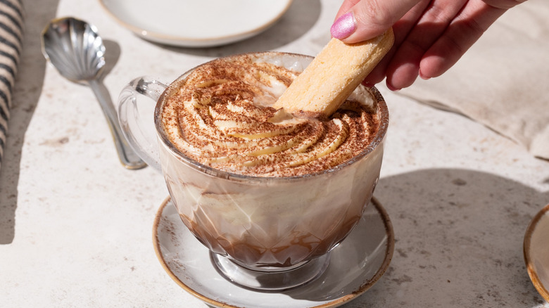 Every coffee lover's favorite no-bake dessert can now be enjoyed as a drink with this boozy tiramisu latte recipe from the kitchen of Tasting Table recipe developer Jennine Rye. This beverage takes the classic flavors of tiramisu and reassembles them into drink form by combining fresh espresso and cocoa with rich, frothy milk and a thick cream and mascarpone topping. Spiked with a shot of Kahlúa, dusted off with cocoa powder (to keep things traditional), and served with a lady finger biscuit for dipping, this boozy tiramisu latte makes for a particularly decadent and creamy accompaniment to any lazy afternoon when you're looking for a little bit of luxury in a mug.