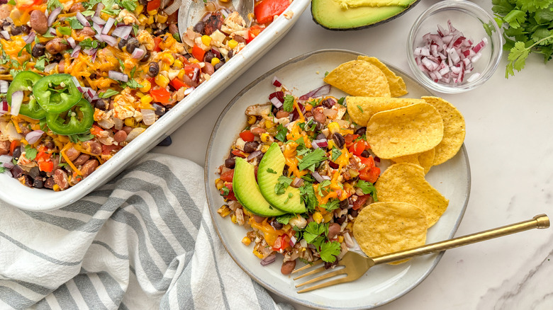 This Mexican casserole is very versatile and can be enjoyed a number of ways. You can enjoy it as a complete meal by serving it in a bowl or on a plate with toppings on the side and crispy tortilla chips for scooping it up. If you want to add a side dish, a simple green salad, a Mexican kale salad, or a tangy slaw all make a nice accompaniment. For an elevated taco Tuesday, use the Mexican casserole as a taco filling by folding it into soft tortillas or hard corn taco shells. You can set up a taco toppings bar so everyone can create their preferred version. If burritos are more your thing, use the casserole as a burrito filling wrapped up in a tortilla. You can serve them as is, or add red or green enchilada sauce.