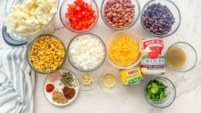 - Add the riced cauliflower, corn, black beans, pinto beans, diced tomatoes, green chiles, green salsa, chili powder, cumin, oregano, smoked paprika, and salt to the pan. Stir to blend.