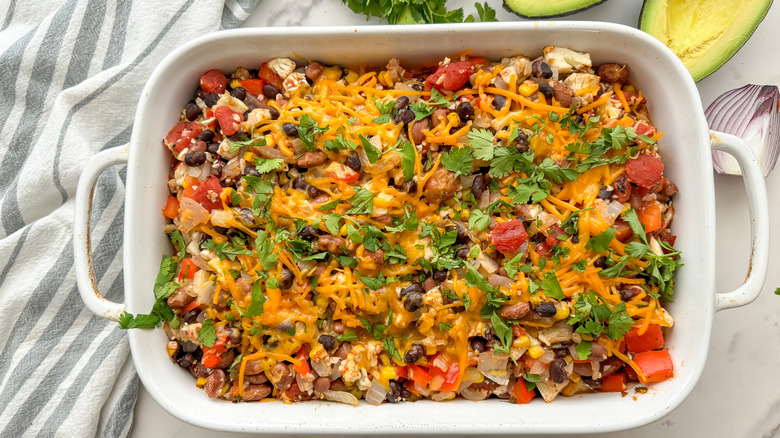 This recipe for Mexican cauliflower rice casserole has all of the makings of a handy casserole — make ahead-friendly, flavor-packed, nutritious, and perfect for leftovers. It's full of hearty beans, smoky fire-roasted tomatoes, tender cauliflower rice, and creamy cheese, balanced with warm spices and fresh herbs. Wellness coach and recipe developer Miriam Hahn brings us this recipe and says, "Even though I am a huge rice fan, sometimes I like the lighter aspect of using cauliflower rice. Because cauliflower is a cruciferous vegetable it offers many health benefits and provides a grain-like feel in this dish."
