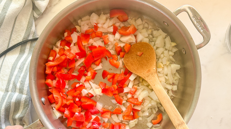 - Add the onion, red pepper, and garlic to the pan and saute for 8 minutes.