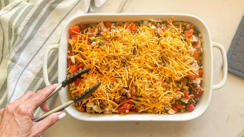 You can absolutely use regular rice in the Mexican casserole, and it is a delicious option. There are two ways in which to do this. The first method is to add cooked white or brown rice to the mix, which is perfect if you have a leftover batch in your fridge. You'll want to add it to the baking dish in step 5 at the same time the recipe calls for you to add cauliflower rice.