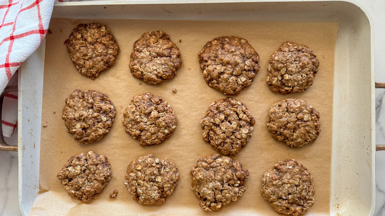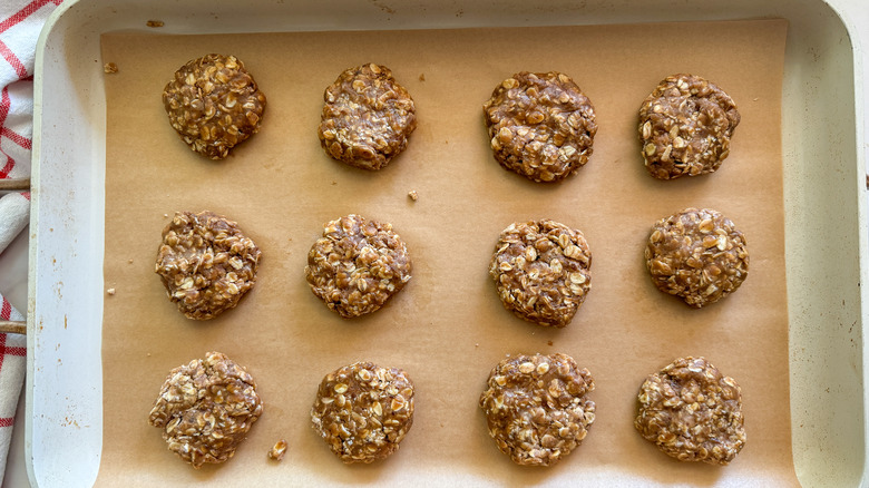 - Form 12 cookies with about 2 tablespoons of the mixture for each cookie, and lay out on the prepared baking sheet.