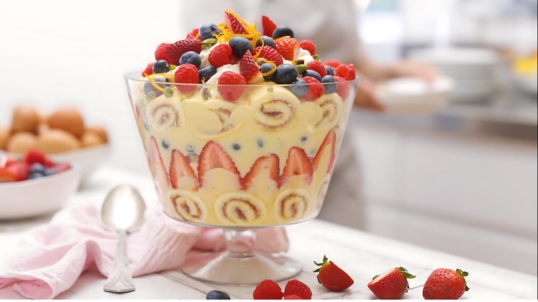 The dessert's name, which means "something of little importance," effectively describes how easy it is to make a trifle — Paul Hollywood suggests that beginners make it. Typically, a trifle is made by creating a base layer of cake pieces soaked with alcohol, then adding a layer of fruit, followed by a layer of custard, and so on. However, the rules are not rigid when it comes to making trifles. Switching the order of layers so that the base layer is cream instead of cake can make a trifle even easier to assemble and puts a fun spin on the classic appearance of a trifle.