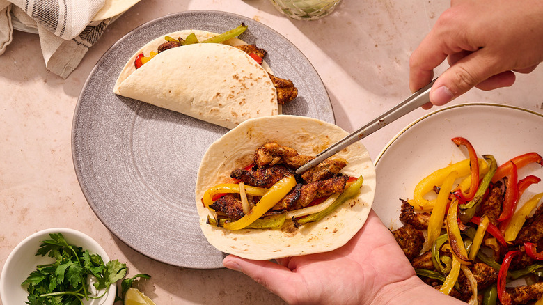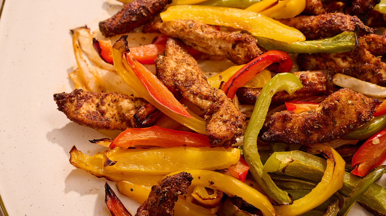 Fajitas are traditionally made with a protein, such as steak or chicken, peppers, and onions, making them instantly recognizable from ingredients alone. This recipe can be swapped almost exactly for sliced skirt or flank steak, or you can make this vegetarian by swapping the chicken for sliced portabella or white mushrooms. There are also other ways to customize fajitas that change up the formula a little more: Just keep the fajita seasoning handy.
