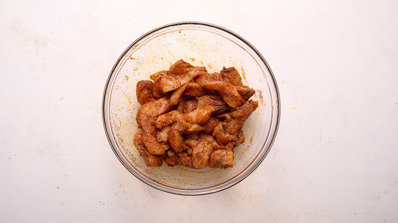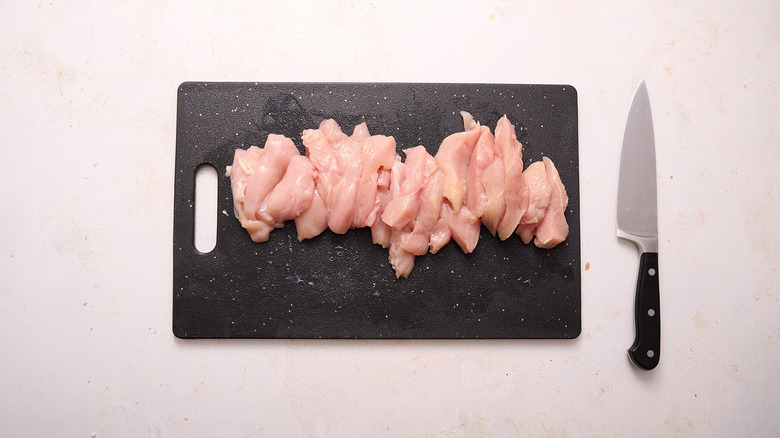 Slice the chicken breasts into 1-inch strips and place them in a bowl.