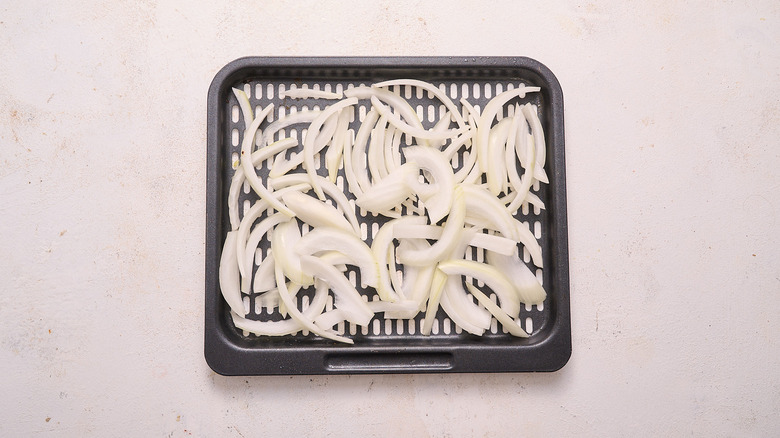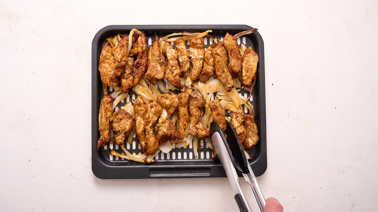 Cooking the meat and peppers on separate trays allows the space to cook a large meal with all the components benefitting from the circulating air of the fryer. You can, however, add the onions, chicken, and bell peppers into one basket and cook with everything overlapping. With this method, instead of rotating the chicken, you'll need to shake the basket to move the elements around and cook evenly. Pause two to three times to shake the basket, cooking until the chicken is deeply browned and the bell peppers very soft.