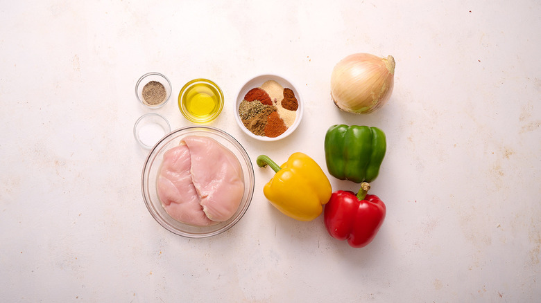 First, you'll need chicken. We like chicken breasts, but you can use skinless, boneless chicken thighs or chicken tenderloins, as well. From there, you'll need the spices to create a fajita seasoning: Chili powder, cumin, Mexican oregano, paprika, salt, pepper, onion powder, garlic powder, and cayenne. Next, you'll need fajita veggies, which we kept simple with Spanish onion and red, yellow, and green bell peppers. Finally, grab a little olive oil to coat the meat and veggies before frying.