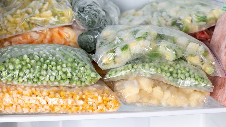 While you probably shouldn't eat frozen vegetables that are more than a year old, their longevity is technically indefinite, and you can keep their quality higher for longer using a simple storage trick. Instead of tearing or cutting open the bag haphazardly and leaving the produce exposed to the cold, dry air that accelerates freezer burn, there's a better way to open bags of frozen vegetables. At the top of the bag, cut out a square shape in the center going down about one or two inches from the top, leaving at least a third of the sealed bag intact on either side of the hole. The result should look sort of like a plastic bag (only without handles cut out for carrying). Now you can tie the two sides together when you're done cooking, making sure to compress it tightly to remove excess air, effectively sealing the veggies inside and preventing freezer burn.