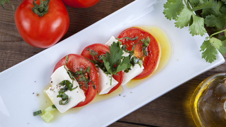 Marinating your silken tofu is the key to giving it a cheesy flavor — that way it doesn't only look like mozzarella, but tastes like it too. Start by slicing it into rounds and then give it a squeeze of fresh lemon juice, a sprinkle of salt, and a dash of nutritional yeast and let it sit for anywhere from 15 minutes to overnight. Plated with your fresh tomatoes and fresh basil, you'll taste the difference. It might even inspire you to elevate your salad even more, with additions such as pesto or toast pine nuts — or you might even want to use tofu as a substitute in your caprese sandwiches and pastas, too. Because, with all that added plant-based protein, why not?