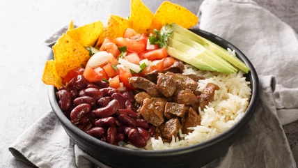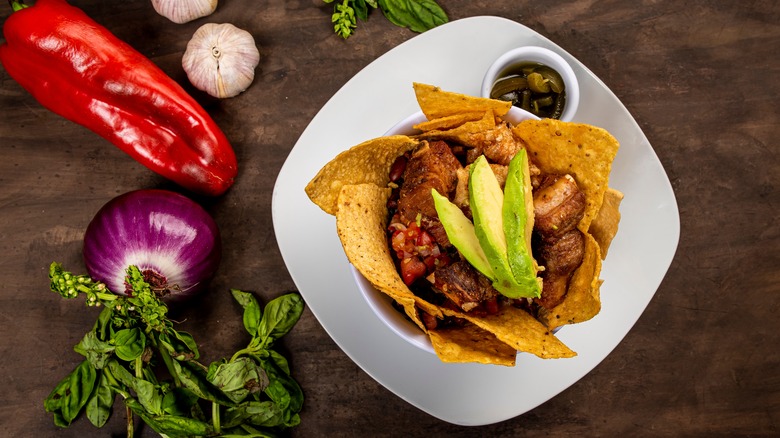 For color and a zesty, tangy complement to cut through the savoriness of the pork and beans, chifrijo is garnished with pico de gallo, sliced avocado, and pickled veggies, and served with a side of tortilla chips.