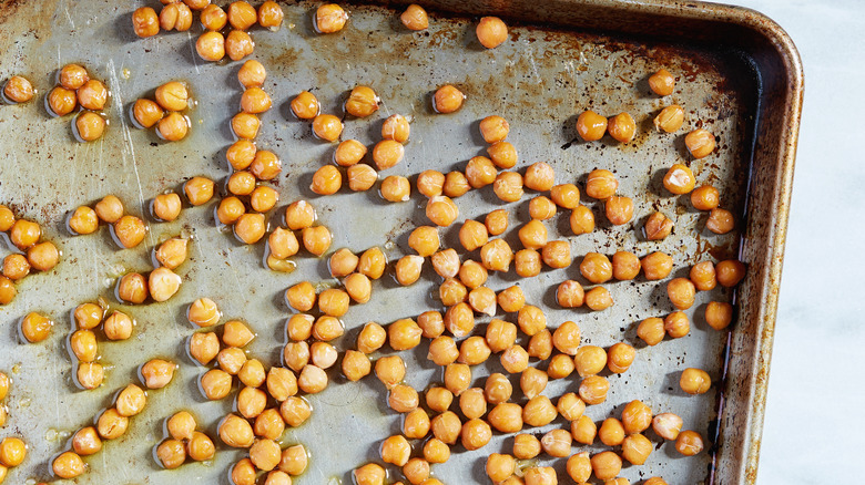 It's no surprise that sugar and chickpeas go together so well. The neutral base that chickpeas offer is the ideal canvas for building a dessert-like flavor. A walk through your local grocery store will even show off an ever-growing selection of sweet chickpea-based hummus, including flavors such as chocolate and cake batter. When it comes to cinnamon sugar chickpeas, however, roasting them produces a result similar to candied nuts. Sweet and nutty with a satisfying crunch, this snack is perfect to enjoy on its own or to add to dishes ranging from a simple summer salad to an upscale goat cheese and apricot appetizer. The best part about making this sweet treat yourself is that because you're starting with canned chickpeas, they're already cooked, saving you a ton of time in the kitchen and getting you to chow time faster.