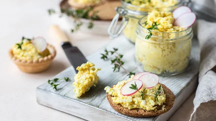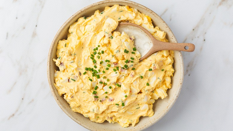 If you love the flavor of protein-packed deviled eggs, why not turn them into a scoopable dip? It's a creative way to literally spread your egg investment to serve a crowd, and solves the problem of wobbly, slick eggs careening around on a platter if you need to take them with you to an event. The mashed yolk filling is already nearly a dip, as anyone who's munched on a bit of extra left from their deviled eggs can attest to. Just up the mayo, fold in a few other additions, and add a bowl of your favorite crispy crackers or chips for a dip that will get all the attention.