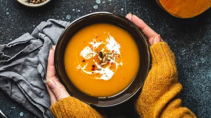 A base of sauteed onions and garlic is essential to pumpkin soup, as they brown and caramelize to accentuate the same sweet and savory duo inherent in pumpkins. You can swap yellow or white onions for leeks if you want to play up the sweetness. Smoky paprika and spicy cayenne would also work really well to complement the sweetness of leek and pumpkin soup. Swap heavy cream for full fat coconut milk to accentuate the nuttiness of the pumpkin. Toasted pumpkin seeds or crispy roasted garbanzo beans will also bring out the nuttiness while providing a nice crunchy contrast to the creamy, pureed soup. A dollop of Greek yogurt, sour cream, feta cheese, or even a squeeze of lime juice will provide that tangy finish to bring the soup's profile full circle.