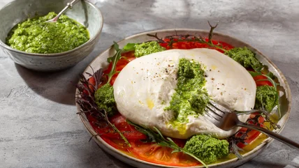 Burrata is mozzarella's creamier relative, and while the ingredient can be served as a delicious dish with little preparation, combining the fresh cheese with a bright pesto recipe can be the flavorful upgrade your meal calls for. Whether you serve a ball of burrata alongside a generous spoonful of a cilantro pesto recipe or take the effort to perform a culinary operation and inject the cheese with pesto, the combination of flavors can whisk you away to the Italian countryside.